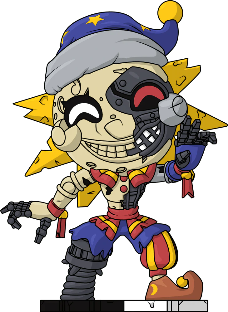 “Naughty! Naughty! It’s time for your nap!!” Standing at 4.9 inches tall with an ominous smile stretching across their face which has been ripped away to reveal a disturbing metallic endoskeleton, jagged sun rays emerge from the sides of Eclipse's round head which is topped with a blue and yellow star patterned night hat. Reaching a blue hand forward towards you as their right hand curls its fingers, the thick coil of a metal leg is planted firmly on the ground next to a brown curled shoe. The exterior of their packaging shines a literal spotlight on Eclipse as they stand in the center of a messy storeroom while the interior is printed with the neon ‘Security breach’ logo and covered in checkered blue and black pattern which works its way onto the protective sleeve as their figure can be seen through the large clear display window at its front. This collectible ships in a matte, embossed, protective outer sleeve and a custom-sized plastic protector for maximum protection during shipping. |
