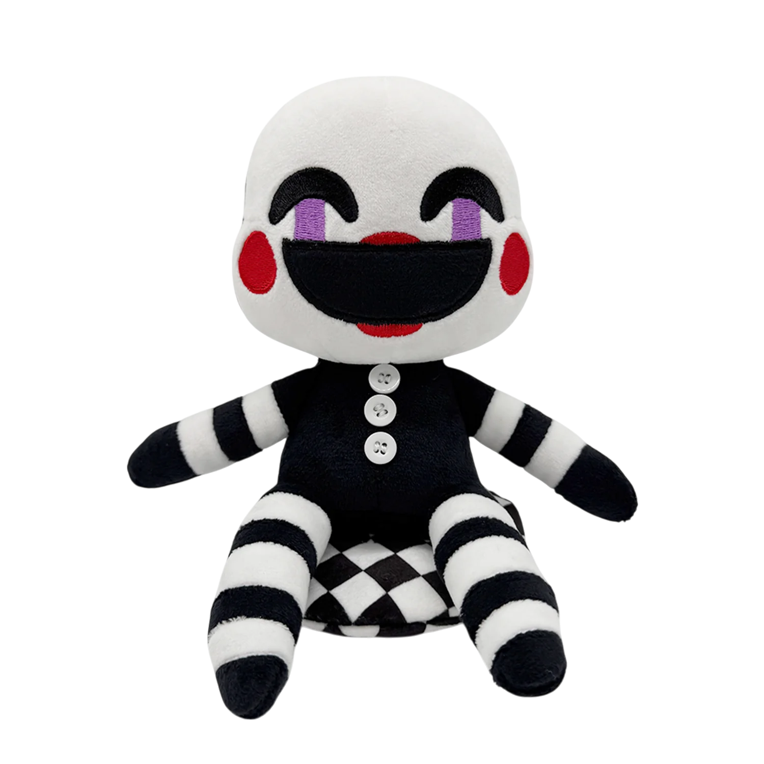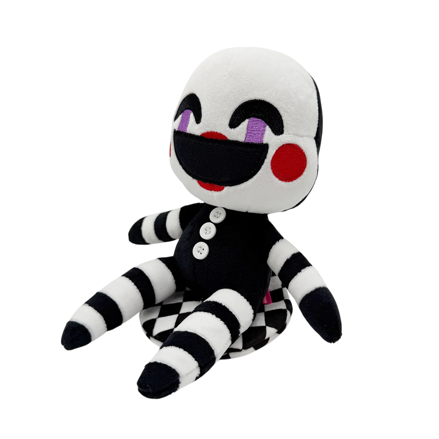 | The Marionette has returned and they’re ready to watch your every move and never leave you alone! Sitting at 6 inches tall with purple lines running from black eyes down to the huge smile creeping across their white face and deep red circles on their cheeks that match thin lips, long striped arms and legs hang from their body as a trio of buttons are attached to their chest. This plushie is made of normal and sublimated minky materials, is packed to the seams with the most huggable squishy 100% PP cotton and comes equipped with a magnetic disc to let it perch firmly atop your shoulder as the best accessory and a true testament to your love of the fandom! |