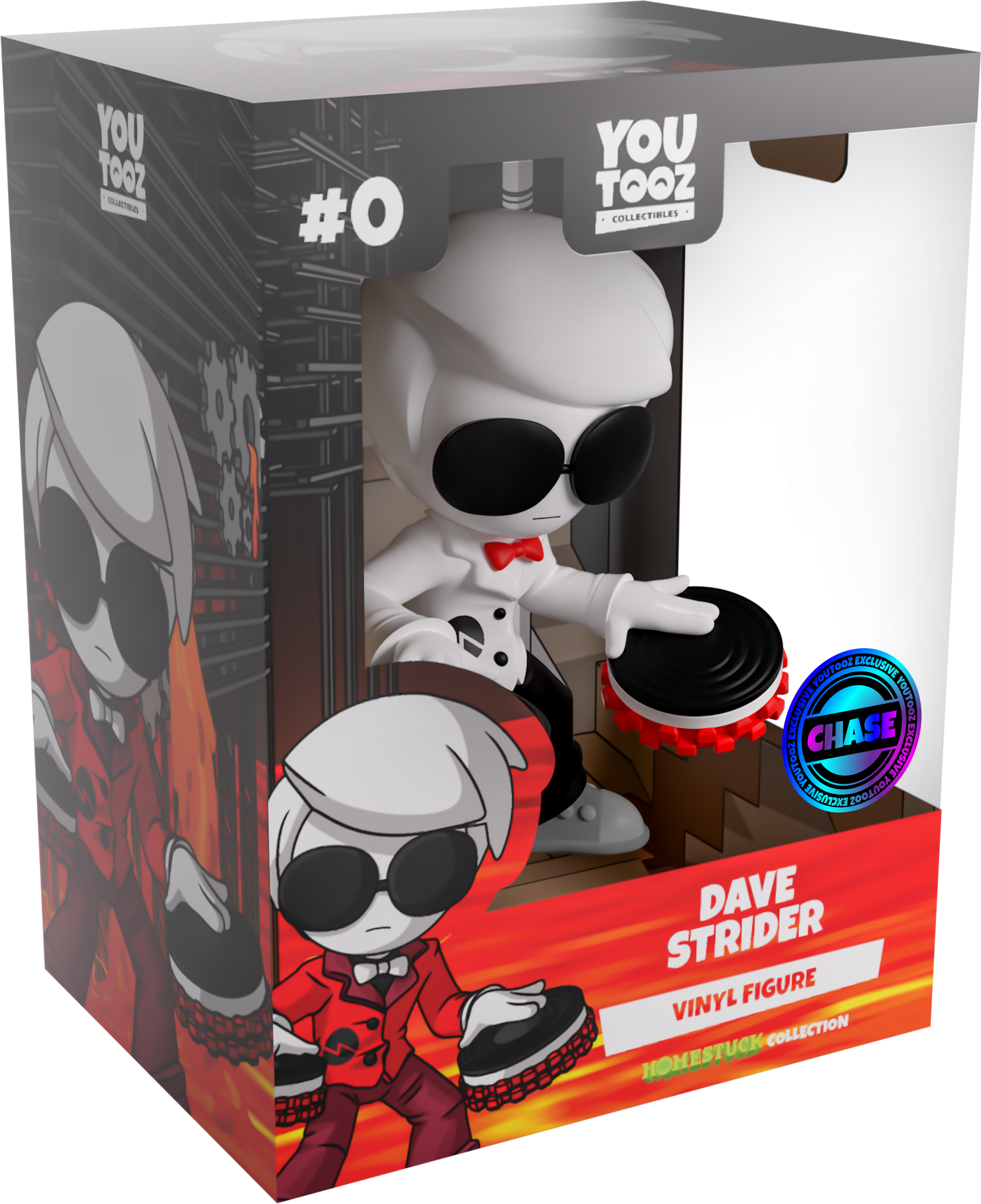Youtooz has booted up Sburb only to be greeted by the Knight of Time himself, Dave Strider! Standing at 4.4 inches tall with an apathetic frown and round black glasses covering his eyes as white hair sweeps over his head, he holds his hands out to the front to spin the illest jams with the black and red turntables attached to his palms. With a white bowtie on the collar of his black shirt, he wears a red suit jacket with a maroon lapel that matches the flared pants covering his black sneakers. But that’s not all! Dave’s got a 1-6 chance for an alchemized Chase version which replaces his outfit with a white jacket, red bowtie, black pants and grey sneakers, so log in and test your luck! The exterior of his packaging is filled with red and yellow lava that spills out of grey metal contraptions, while the interior sees the Alchemiter alone in a multilevel brown building. The protective sleeve is then covered in a warping checkerboard underneath a cloud filled blue sky, as his figure can be seen through the large, clear window at the packaging’s front. This collectible ships in a matte, embossed, protective outer sleeve and a custom-sized plastic protector for maximum protection during shipping.